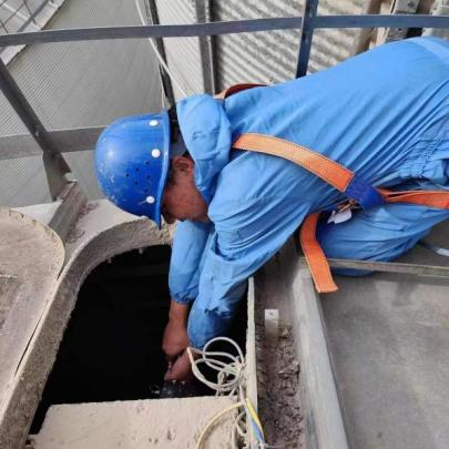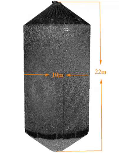 In order to improve the management level and realize the dynamic and precise control of feed, a large-scale breeding farm needs to grasp the empty volume inside the feed tank in time to provide decision-making assistance for feed production and distribution plans. The height of the tank is about 22m, the diameter is about 10m, the top and bottom are cones, and the middle is a cylinder.