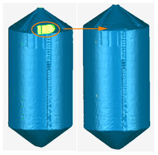 Complete point cloud data is helpful for tank model encapsulation and reduces model vulnerabilities. Since there is an opening on the top of the tank, surface fitting can be performed according to the point cloud data around it, and the tank can be packaged as a whole to eliminate model loopholes. The packaging of a single tank model takes about 20 minutes.