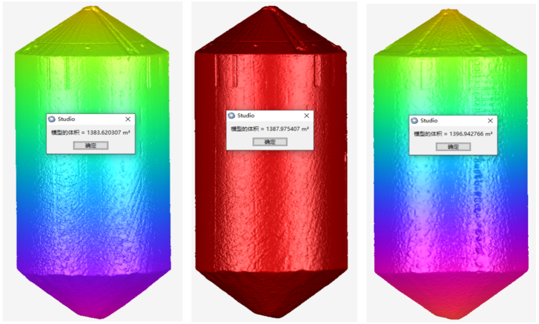 Use analysis tools to calculate tank volumes. The volumes of the three tanks are 1383.62m³, 1387.98m³, and 1396.94m³ respectively. After communicating with the owner, the empty volume of the tank is 1400m³. Since there is a small amount of residual feed at the bottom of the tank during field scanning, the calculation results are all less than 1400m³, which is in line with the actual situation.
