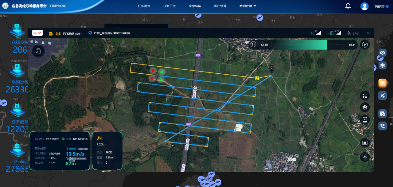 In January 2021, the Guangxi Department of Natural Resources took the lead in developing a UAV emergency surveying and mapping linkage service platform in the country based on Internet thinking and learning from the "Didi Taxi" model. Relying on the National Emergency Surveying and Mapping Support Nanning Base and using the emergency surveying and mapping service platform, Guangxi is the first in the country to create a new model for online sharing of emergency surveying and mapping equipment, realizing cross-platform and cross-regional real-time mobilization of various types of unmanned aircraft and emergency surveying and mapping teams, and enabling teams to arrive at the scene within 2 hours , 4-hour data backhaul has greatly improved the rapid response and support service capabilities of emergency surveying and mapping in Guangxi and surrounding provinces.