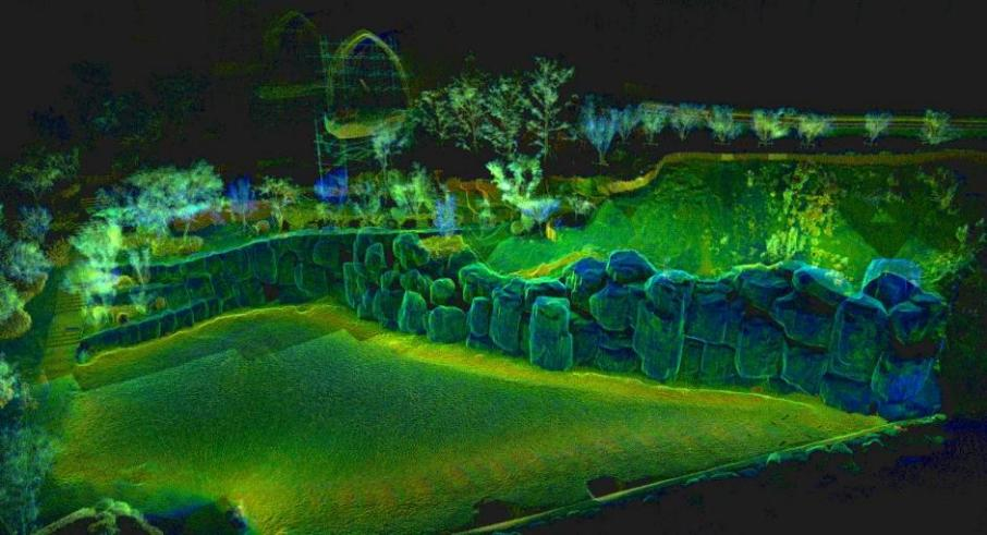 SLAM100 is a mobile handheld 3D laser scanning device independently developed by us. It is small and portable, and can quickly obtain high-precision 3D laser point cloud data of objects, build a 3D visualization model of complex and irregular scenes, and realize the distance of irregular objects, Geometry information such as surface area and volume can be calculated to meet application requirements such as engineering quantity budget evaluation, landscape planning and construction, and completion acceptance. SLAM100 is used for digital scanning of plastic rockery, which has the following advantages: