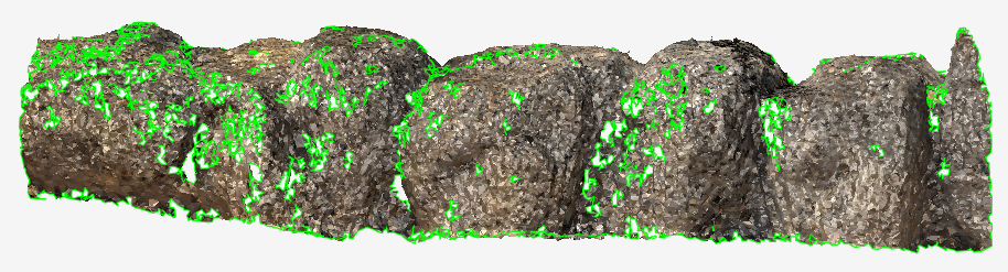 Point cloud packaging and model restoration. Its principle is to approximate and restore the solid model with many small spatial triangular patches, so that it will not produce large deformation. The green outline is the boundary of the hole in the initial packaging model. It takes 4 hours to perform surface fitting through the point cloud around the hole, repair the hole, and complete the point cloud packaging. The calculated surface area is 1248.4㎡.