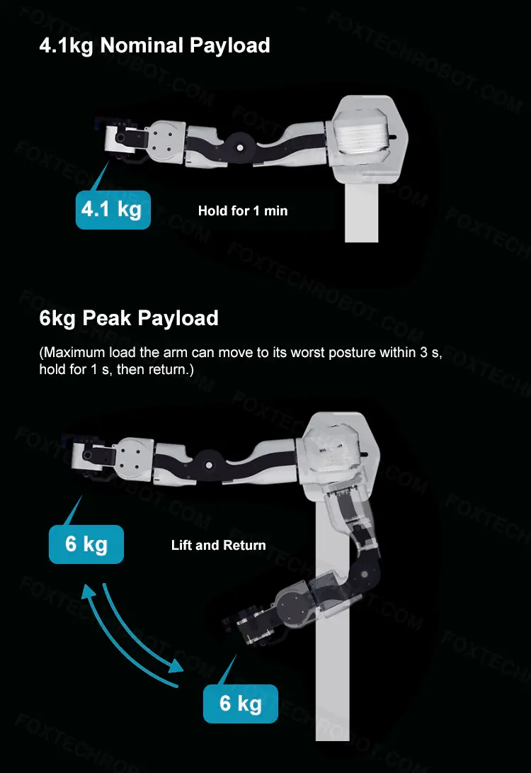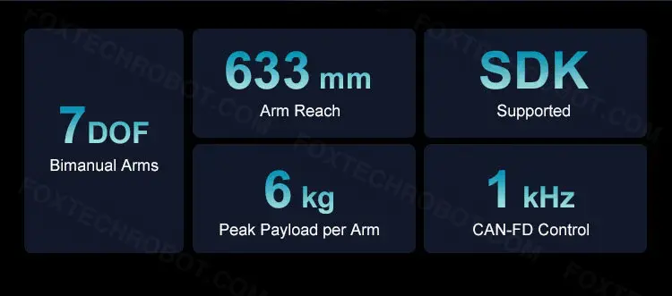 Each arm offers 7 degrees of freedom, 633 mm reach, 5.5 kg weight, and up to 6 kg peak payload, with high-speed 1 kHz CAN-FD control for precise, responsive motion.