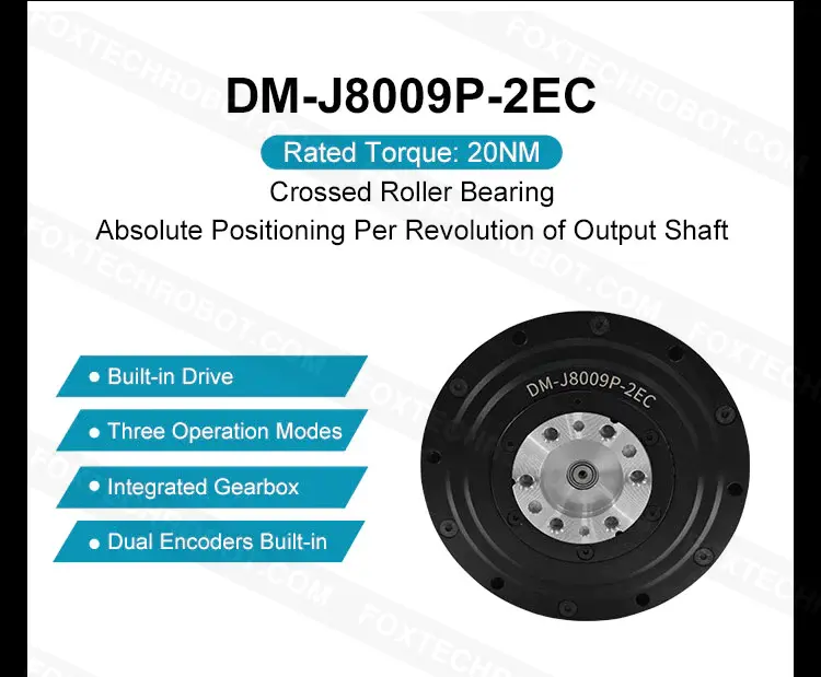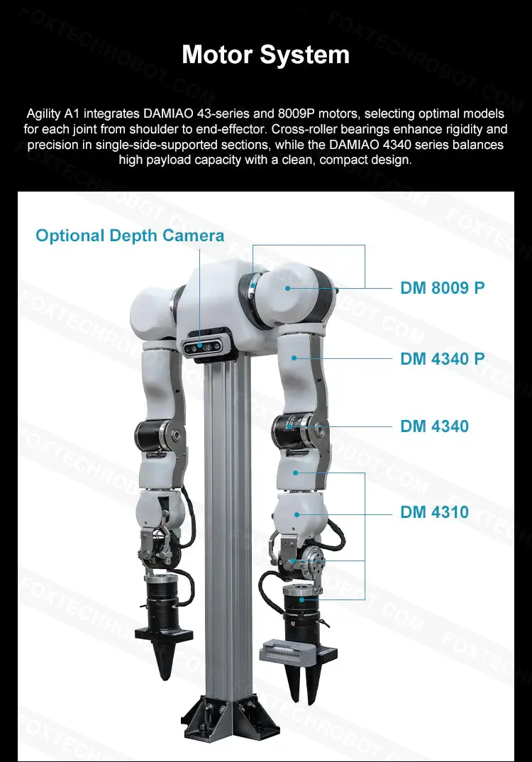 The motor system combines DAMIAO 43-series and 8009P motors, with cross-roller bearings for rigidity and precision, while the DAMIAO 4340 series delivers high payload capacity in a clean, compact form.