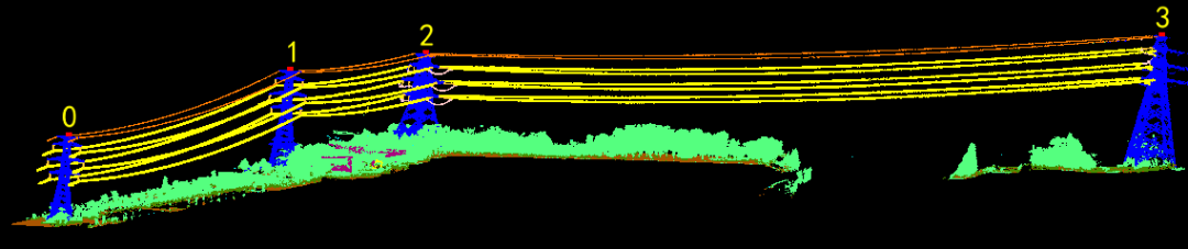The point cloud data of overhead transmission line channel conductors, ground wires, jumpers, towers, and insulators are clearly covered, the structure is complete, and the four-split conductors are clearly visible.
