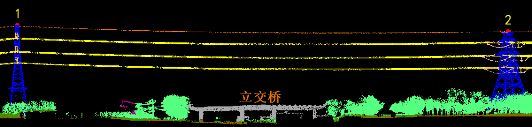 The average point density of the point cloud of the overhead transmission line channel is 980 points/㎡, and the double circuit on the same tower is quickly drawn, and the power lines across the river and overpass are complete and continuous without interruption.