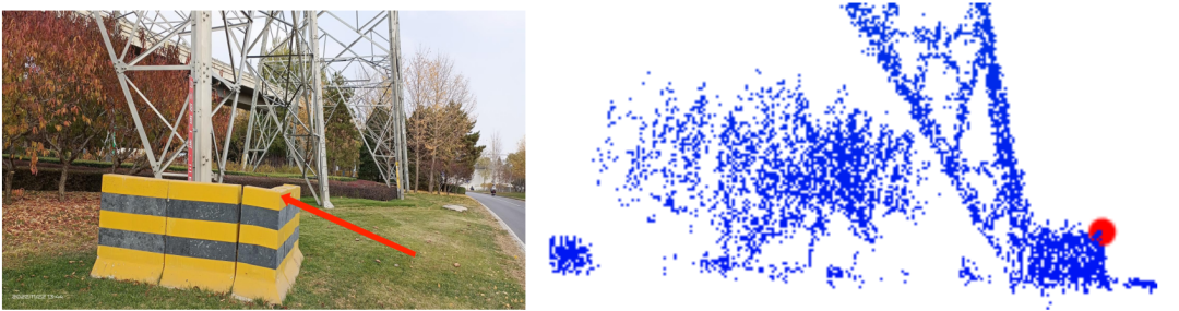 Match the point cloud with the GNSS-RTK measured corner points of the tower base (the red points are the measured checkpoints, a total of 16), and compare and check the accuracy of the point cloud. The error in the plane of the point cloud is 5.3cm, and the error in the elevation is 4.7cm.