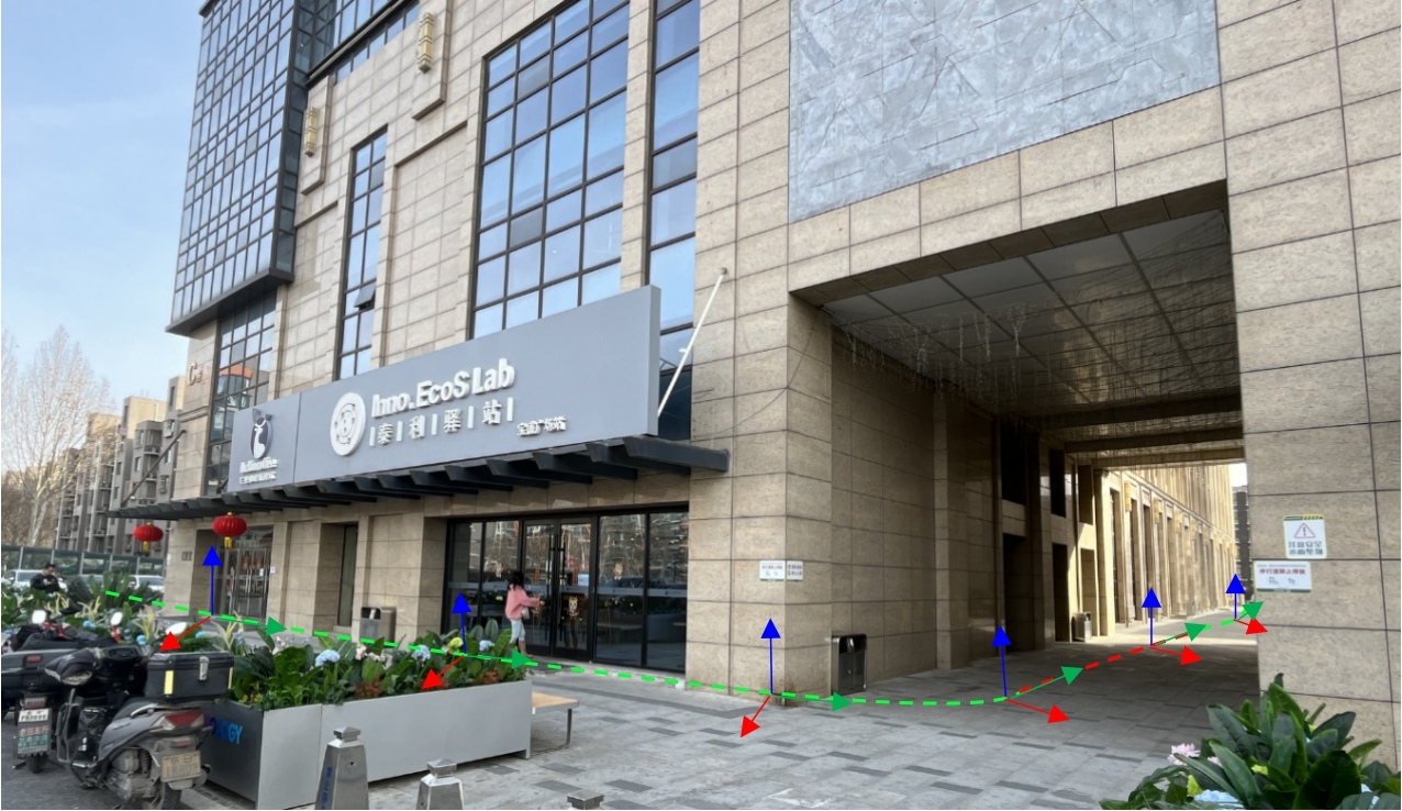 As shown in the figure above, the superstation RTK collects position information based on the RTK data obtained by GNSS in a normal outdoor environment (green track), and at the same time corrects the pole height and inclination based on the SLAM posture. If it is caused by tilt or inversion, If the GNSS signal is blocked, the laser SLAM odometry can continue to perform position and attitude navigation; after entering a GNSS-free environment (red track), the GNSS signal is lost, and the laser SLAM can continue to perform position and attitude navigation and accurately obtain the position of the point to be collected. Coordinate information; when returning to an outdoor environment from an environment without GNSS signals, data collection can be continued continuously. If the area without GNSS signals is large, you can ensure the accuracy of the collected coordinates by going outdoors several times to receive a section of GNSS data and then returning it indoors. You can also perform post-processing as needed to further improve the data accuracy.