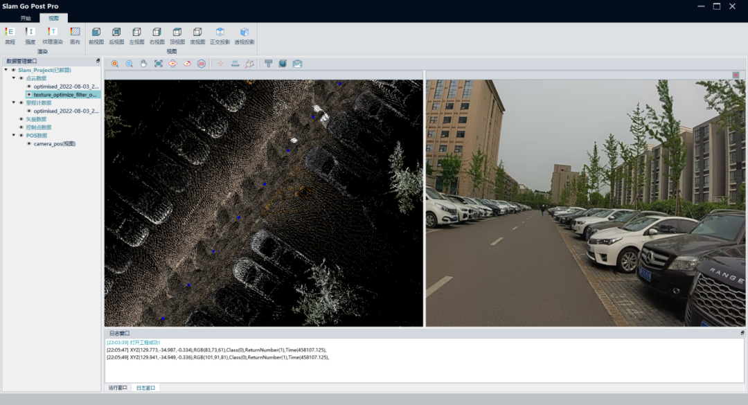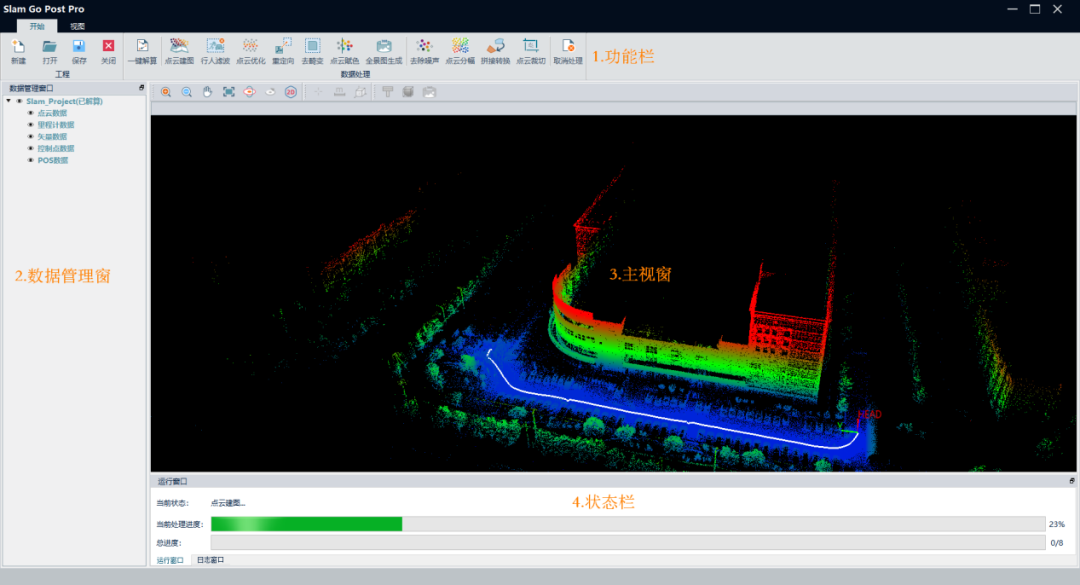 ♦ The main window is used to display point cloud, odometer, video POS, panorama and other results.