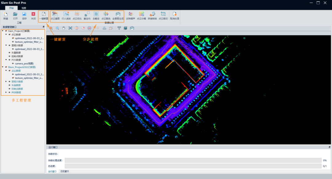 ♦ One-click processing: One-click processing for a certain project, the software will sequentially perform steps such as point cloud mapping, pedestrian filtering, point cloud optimization, and redirection, and directly output the final standard results.