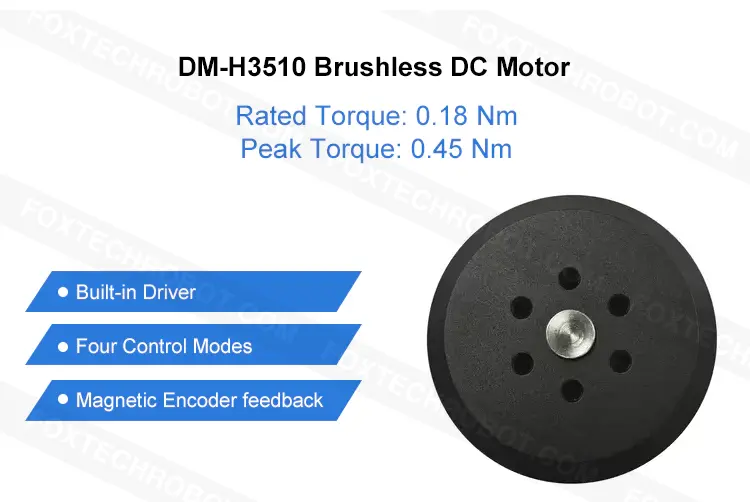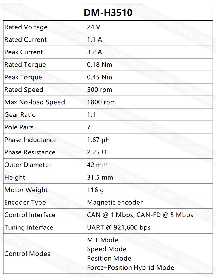With this product, you earn 42 loyalty points.The DM-H3510 is a compact 42 mm direct-drive BLDC motor with a built-in driver and magnetic encoder. Running at 24 V, it delivers 0.18 Nm rated torque (0.45 Nm peak) at a 500 rpm nominal speed (max 1800 rpm no-load). The controller supports four control modes—MIT, Speed, Position, and Force-Position Hybrid—with CAN @ 1 Mbps / CAN FD @ 5 Mbps for real-time control and telemetry, plus UART @ 921,600 bps for configuration. Its 1:1 direct-drive design, 31.5 mm height, and 116 g weight make it easy to integrate in tight spaces.