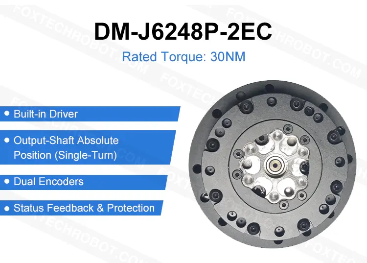 The DAMIAO DM-J6248P-2EC is an all-in-one brushless servo joint for robotic arms, integrating the motor and driver in a compact module. Dual encoders provide single-turn absolute output-shaft positioning, while CAN FD (up to 5 Mbps) with PC visual tuning and CAN parameter read/write enables precise control with rich telemetry and built-in protections.