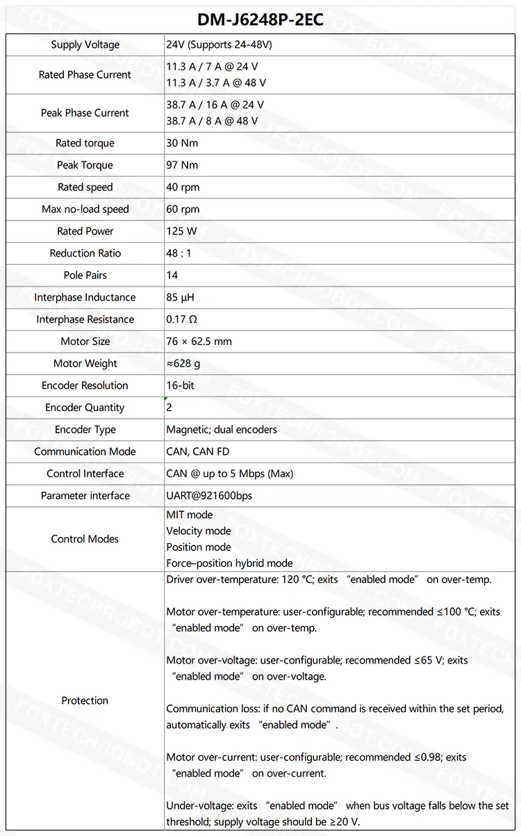 Telemetry & protection: speed/position/torque/temperature feedback, dual-temperature protection, CAN firmware upgrade